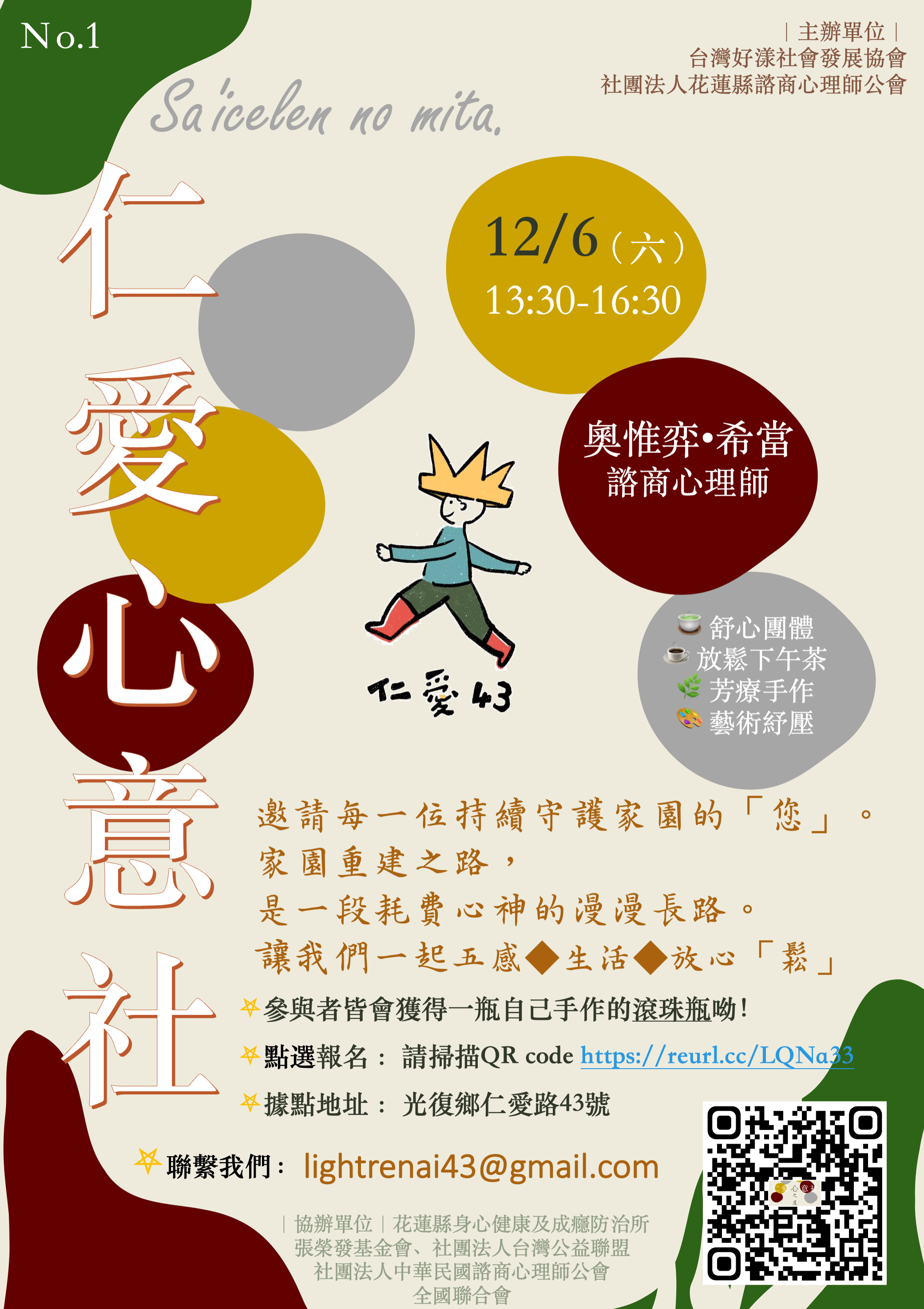 光復鄉仁愛路 43 號,舉辦一系列 【午後舒心工作坊】